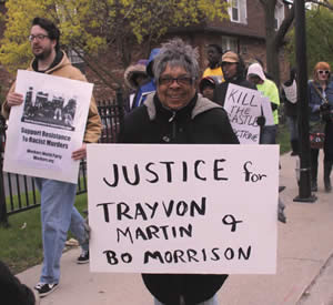 The rally began at the King Statue for a program of community speakers, and then the group marched to the 5th District Police Station at 4th and Locust. The event was organized by ‘The Coalition for Justice for Trayvon and Bo Morrison’, and it is comprised of various organizations; Occupy the Hood, Peace Action WI, National Black United Front, Occupy Milwaukee, WI Bail Out the People Movement, Africans On The Move, Students for a Democratic Society, Nation of Islam Muhammad Mosque #3, Voces de la Frontera, Milwaukee Brotherhood of Fire Fighters, Milwaukee NAACP, American Civil Liberties Union, WI Jobs Now, Latin American Solidarity Committee, International Action Center, Gay Straight Alliance of Rufus King H.S., Occupy Fond Du Lac and AFSCME Local 82.