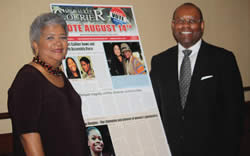 During the Congressional Black Caucus 42th Annual Legislative Week, the National Newspaer Publishers Association (NNPA) and Nielson unveiled the 2012 Nielsen Report for African American consumers. Dorothy Leavell, publisher of The Crusader Newspapers based in Chicago and Larry Waters, director of Multicultural Relations for MillerCoors stand next to a front page blowup of The Milwaukee Courier that was featured with other Black newspapers from across the nation at the event. (C. Geary photo)