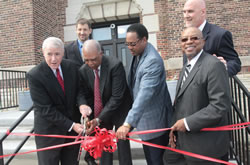 Proudly cutting the ribbon for the Sherman Park Commons Opening Day event are from (l to r) Mayor Tom Barrett, Dr. Gregory Thornton, Alderman Willie Wade, Wyman Winston, and in the back on the left is Ted Matkom and Jim Popp on the right. (Photo by Robert A. Bell)