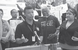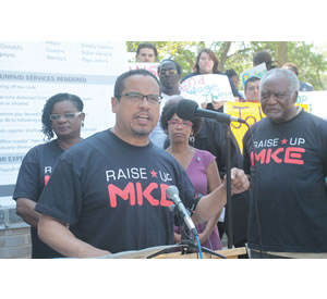 U.S. Congressman Keith Ellison of Minnesota donned the “Raise Up MKE” T-shirt while he addressed the crowd at the rally held this week in front of the Department of Workforce Development at 819 N. 6th Street. Joining him were Congressman Danny Davis of Illinois, Gwen Moore and State Senator Nikiya Harris is in the backgound. (Photo by Robert A. Bell)