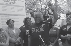 Congressmen Keith Ellison of Minnesota, and Danny Davis of Illinois along with Moore joined the ‘Raise up Milwaukee’ campaign for a rally at the Wisconsin Department of Workforce Development, the local agency responsible for policing wage theft, to tell unscrupulous employers who steal money from workers it’s time to pay up.
