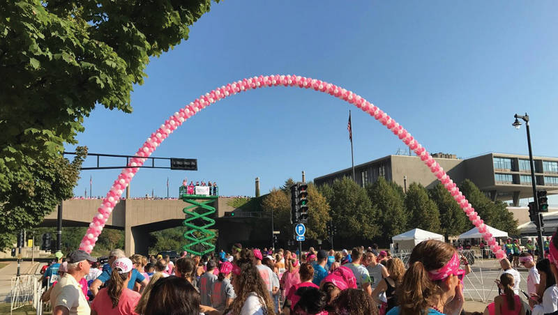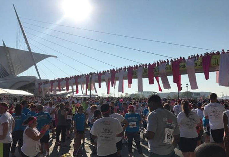 “Pink Banners of Hope” line the walkway bridge of the Calatrava (The Milwaukee Art Museum.) (Photo by Chris Davis)