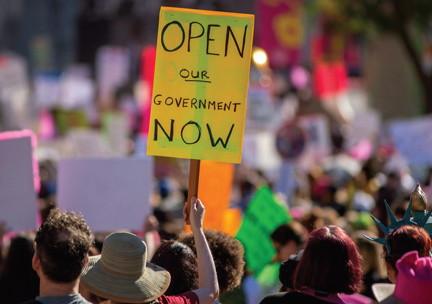 A placard calls for an end to the partial government shutdown during the Third Annual Women’s March LA in downtown Los Angeles, California on January 19 (Photo by DAVID MCNEW/AFP/Getty Images
