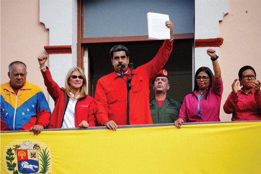 Venezuelan President Nicolas Maduro announces he is breaking relations with the U.S., to supporters from a balcony at Miraflores presidential palace in Caracas, Venezuela, Wednesday, Jan. 23, 2019. | AP Photo/Ariana Cubillo