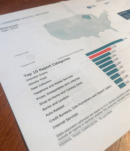 This database also accounts for various reports received by the other agencies, such as the Better Business Bureau and DATCP. According to Todd M. Kossow, regional director for the FTC, last year the database had received more than 1.4 million nationwide fraud reports with reported losses of nearly 1.5 billion dollars. Of that, Wisconsin reported 19,000 fraud reports and a loss of 13 million dollars. A majority of the fraudulent complaints correlated to imposter scams. Imposter scams can be characterized as tech support scams, IRS imposter calls, social security administration calls, the grandparent scam and romance scams. Basically, any scam where somebody pretends to be somebody they are not, in order to get your money. Last year, nearly 85,000 fraud reports of imposter scams came solely from the Milwaukee metropolitan area. But imposter scams aren’t the only way victims can fall prey to fraud.
