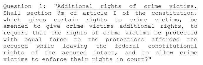 The 64-word ballot question to amend the Wisconsin State Constitution to add victim rights made no mention of its effect on police transparency in cases where law enforcement officers claim privacy rights as crime victims. The Wisconsin Supreme Court voted 6-1 to uphold the amendment after a lower court ruled the question was too vague.