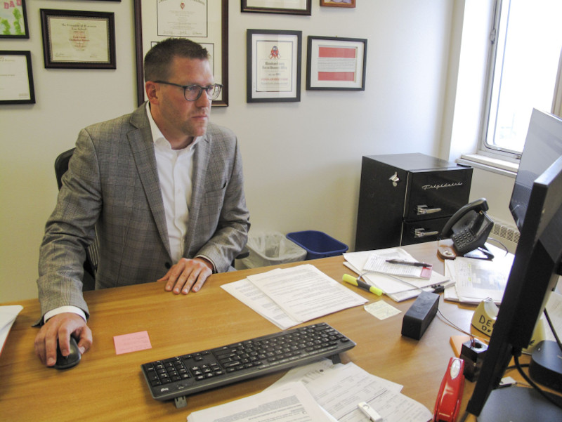 Winnebago County District Attorney Eric Sparr, photographed in his Oshkosh office on July 18, 2023, has agreed with Oshkosh police not to release the names of officers involved in recent police use of force incidents, citing the victim rights protections in Marsy’s Law. (Jacob Resneck / Wisconsin Watch)