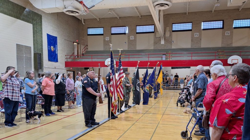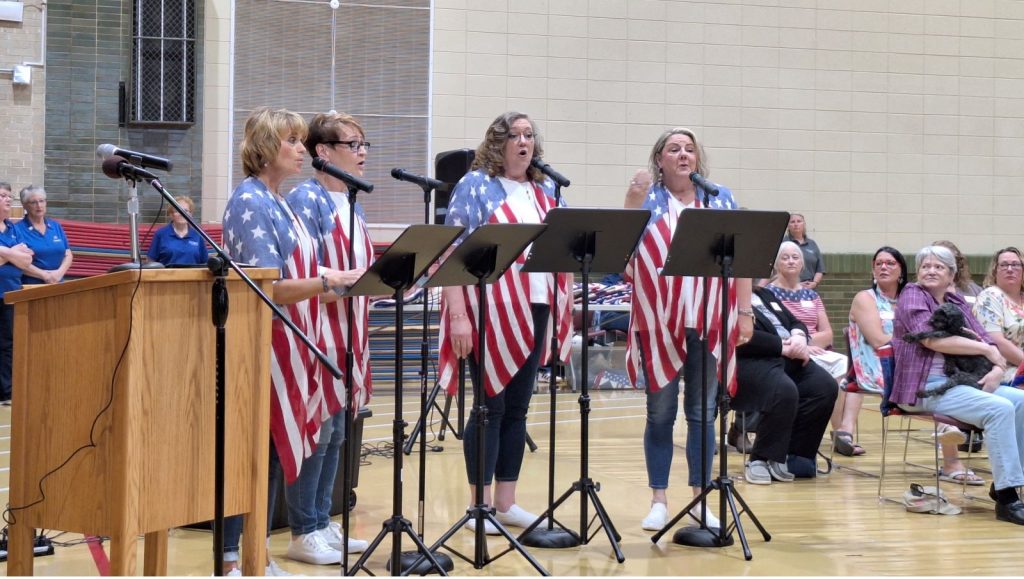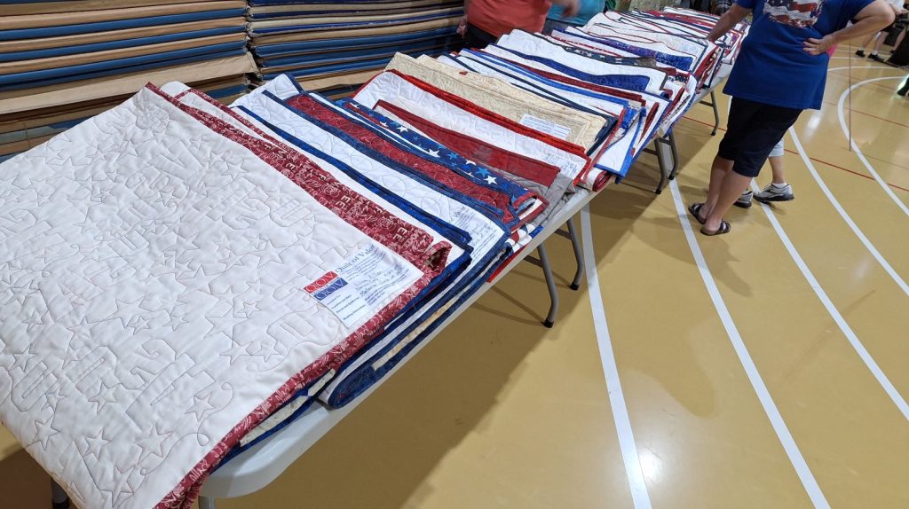 Wisconsin Rapids, Wis (WFHR, WIRI) – The Lincoln High School Band welcomed people as they entered the East Junior High School Fieldhouse for the Quilts of Valor Presentation on May 25th. They played military and patriotic music as well over 100 people found their seats in preparation for the event. Forty-five women veterans sat facing the crowd of people that buzzed with excitement and anticipation. The Material Girls of Wisconsin Rapids had a line of tables placed behind the veterans. All the quilts were folded and ready for the honorary wrapping of each veteran as the quilts are awarded.
