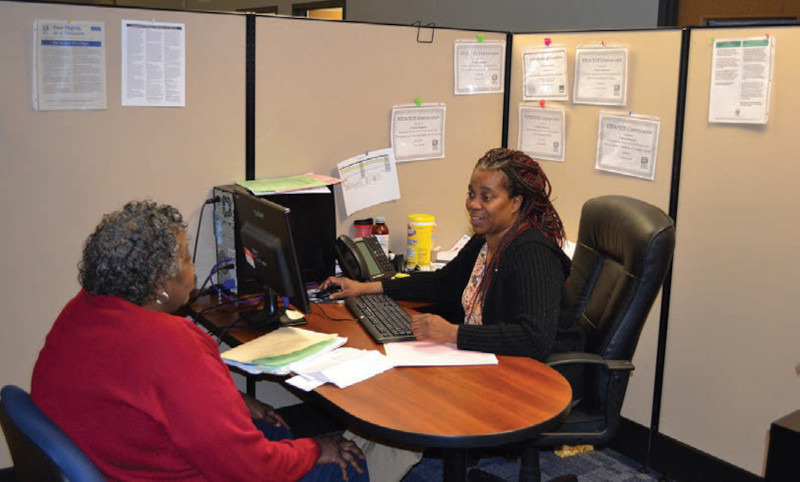 A worker with the Social Development Commission Volunteer Income Tax Assistance program helps a client file taxes. SDC is preparing to reopen four main program areas, including the VITA program, after being closed to the public for seven months. (Photo provided by the Social Development Commission)