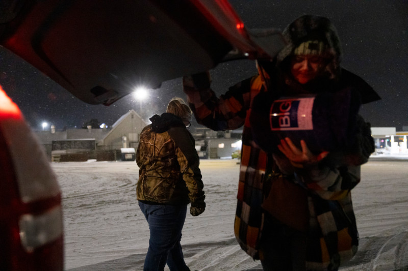 Britanie Peaslee, right, closes the trunk after unloading blankets as she and Sandy Hahn check for people sleeping in their cars Jan. 22, 2025, in Johnson Creek, Wis. The annual “point in time” (PIT) count of homeless people in the United States happens on the same night in January. Advocates note several limitations in the methodology, including a recent U.S. Supreme Court decision that could drive more homeless people into hiding. (Joe Timmerman / Wisconsin Watch)