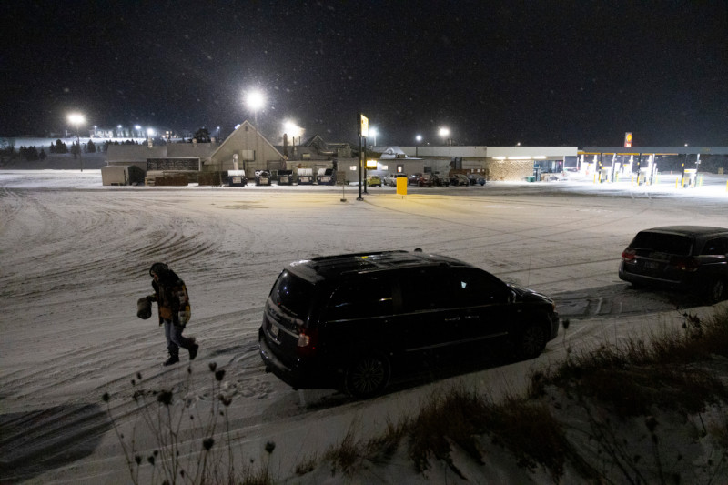 Britanie Peaslee walks in the parking lot behind the Pine Cone Travel Plaza in Johnson Creek, Wis., during the PIT count on Jan. 22, 2025. There was a marked increase in homeless people identified during this year’s annual count of homeless people in Jefferson County, but those numbers won’t be reported until December, long after the state finalizes its two-year budget plan. (Joe Timmerman / Wisconsin Watch)