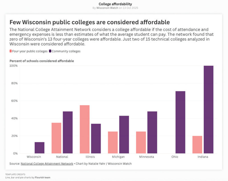 The analysis included 28 Wisconsin colleges, finding that all of the state’s public four-year schools and nearly 90% of the technical colleges were unaffordable.