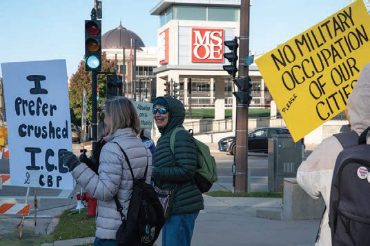 Students and others protest in front of the U.S. Immigration and Customs Enforcement building leased from the Milwaukee School of Engineering on Oct. 31. The protests have taken place every Friday at 9 a.m. (Photo by Jonathan Aguilar / Milwaukee Neighborhood News Service / CatchLight Local)