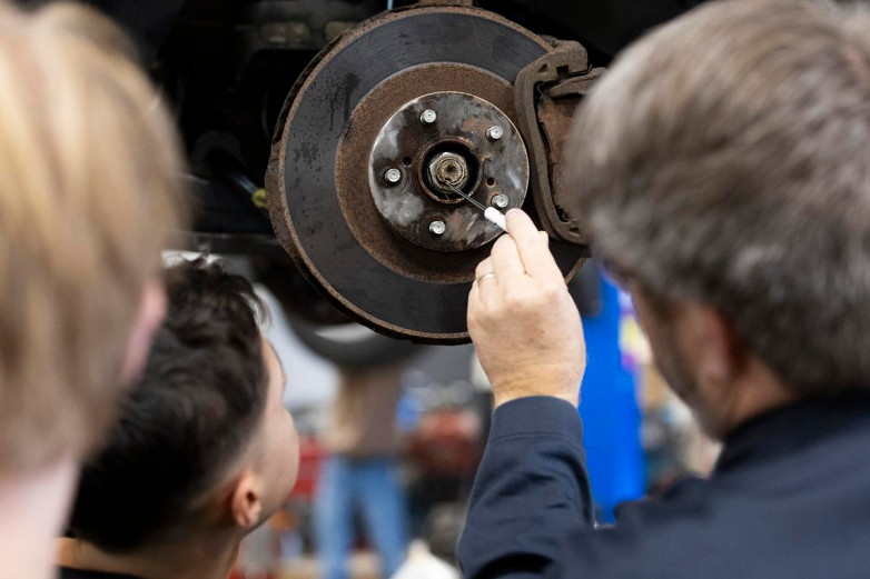 At one bay, a junior adjusts the valves of an oxygen-acetylene torch and holds the flame to a suspended Subaru’s front axle to loosen its rusty bolts. Steps away, two classmates tease each other in Spanish as they finish replacing the brakes on a red Saab. Teacher Miles Tokheim moves calmly through the shop, checking students’ work and offering pointers.