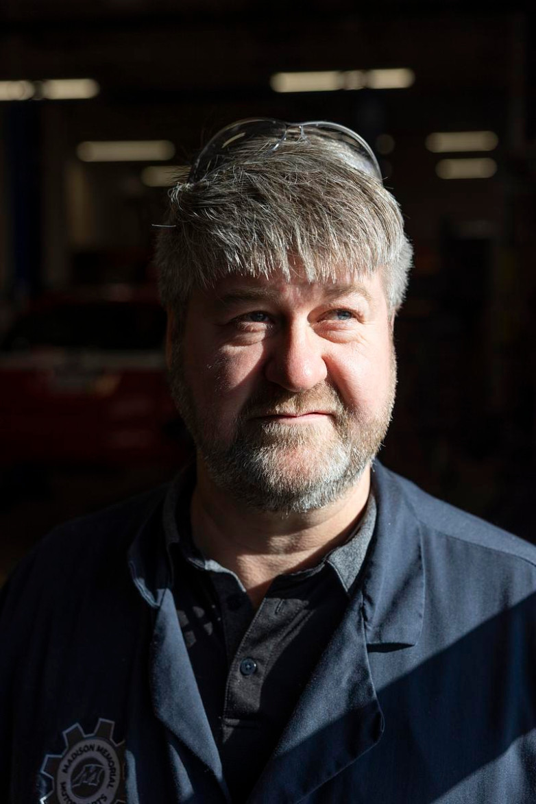 Miles Tokheim, a technology and engineering teacher, poses for a portrait during an Auto 3 dual enrollment class, Wednesday, Nov. 12, 2025, at Vel Phillips Memorial High School in Madison, Wis. (Joe Timmerman / Wisconsin Watch)