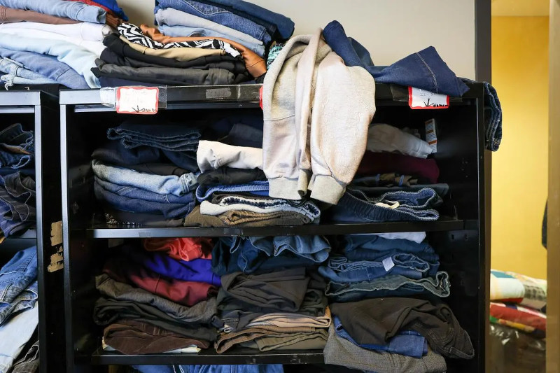 Pants organized by size sit on shelves ready for anyone who needs them.
