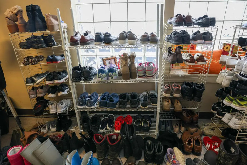 Shoes in all different sizes and styles sit on a rack inside the clothing bank.