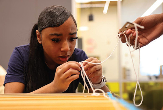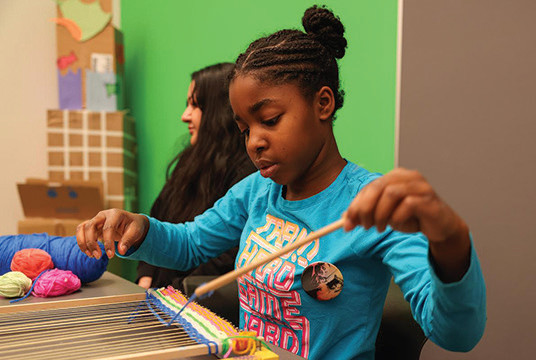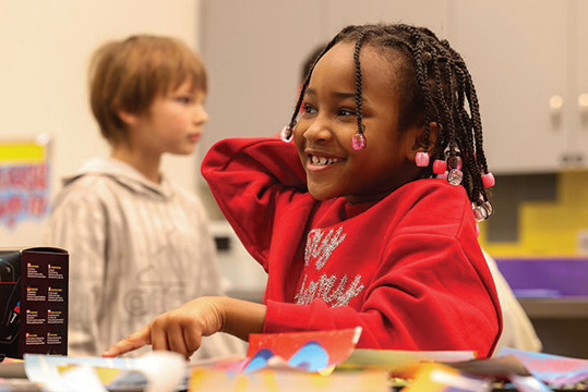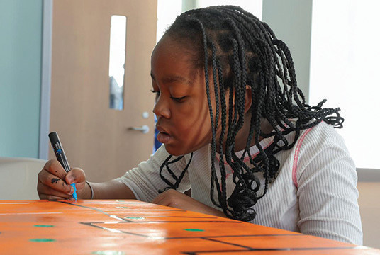 Loyalty McCoy, 7, smiles while working on a custom sticker.