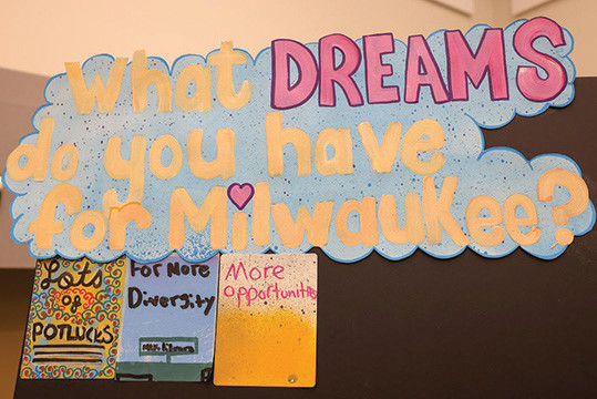 A board with visitor-made stickers describes the dreams that different Milwaukee residents have for their community.