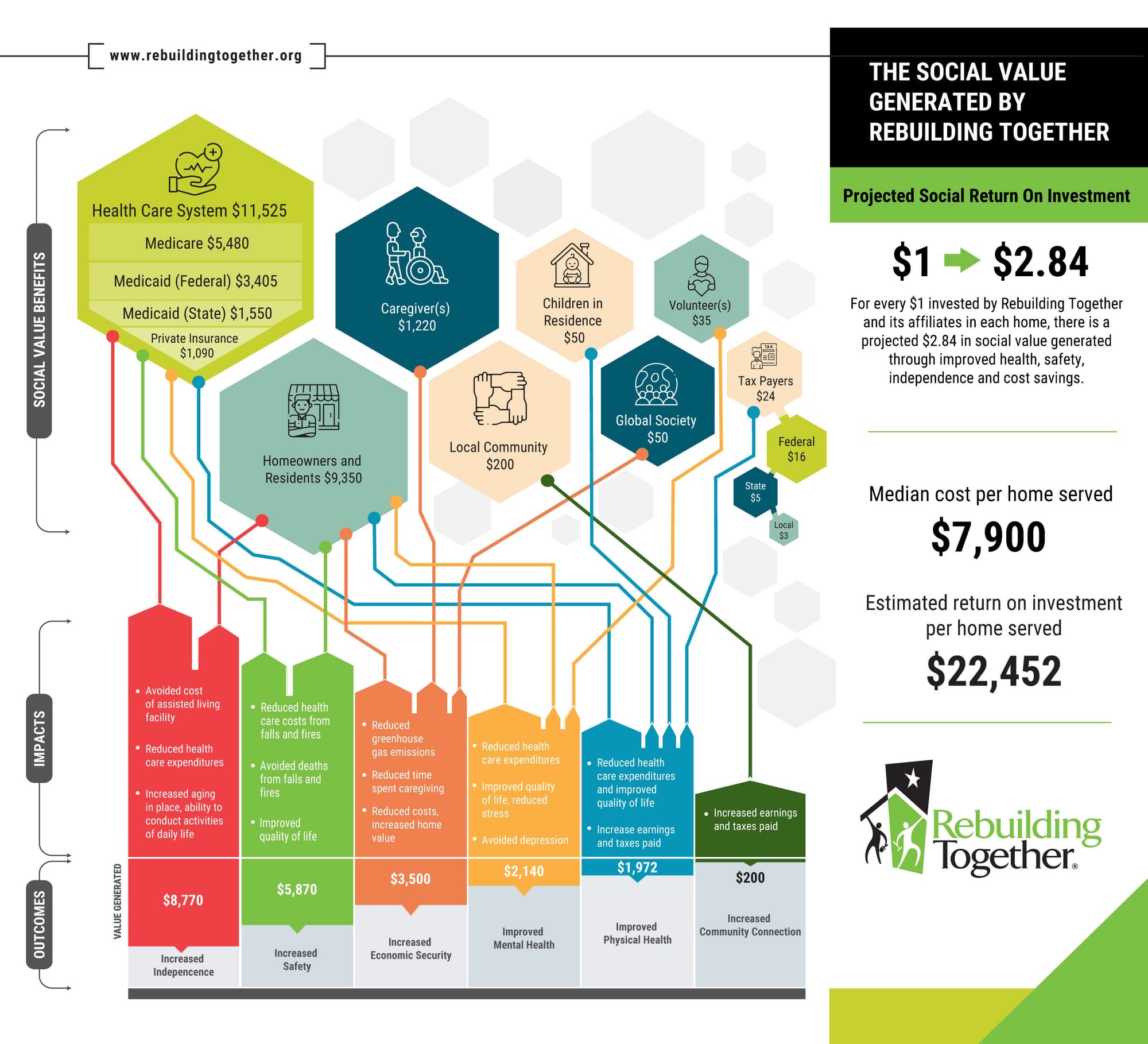 Because of the interconnectedness of so many social ills, the return on investment into Rebuilding Together, like with so many other systemic problems that society attempts to address at their roots, is significant. The Rebuilding Together national website says that for every dollar spent on a project, there is a return of nearly three dollars in savings in social value, such as improved health, independent living, safety and long-term costs to taxpayers. The median investment in an RT home project is around $8,000. But the projected return on that investment is more than $22,000.