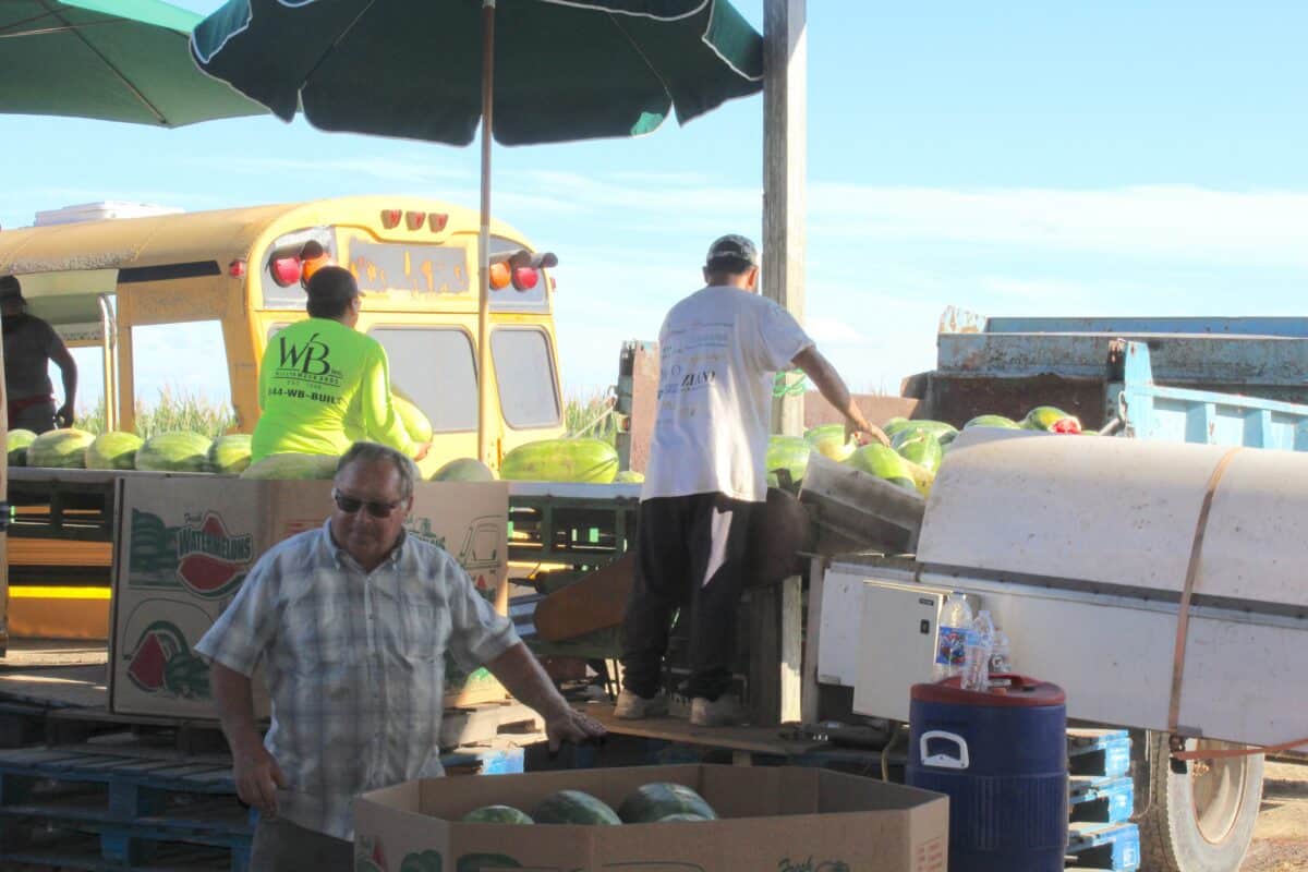 On his farm near Harrington, Delaware, Dave Marvel grows about 50 to 100 acres of watermelons, depending on the year. This crop thrives in southern Delaware’s sandy soil, and migrant workers can often be seen in the fields in the fall, picking watermelons and tossing them up into old school buses modified to serve as cargo haulers.
