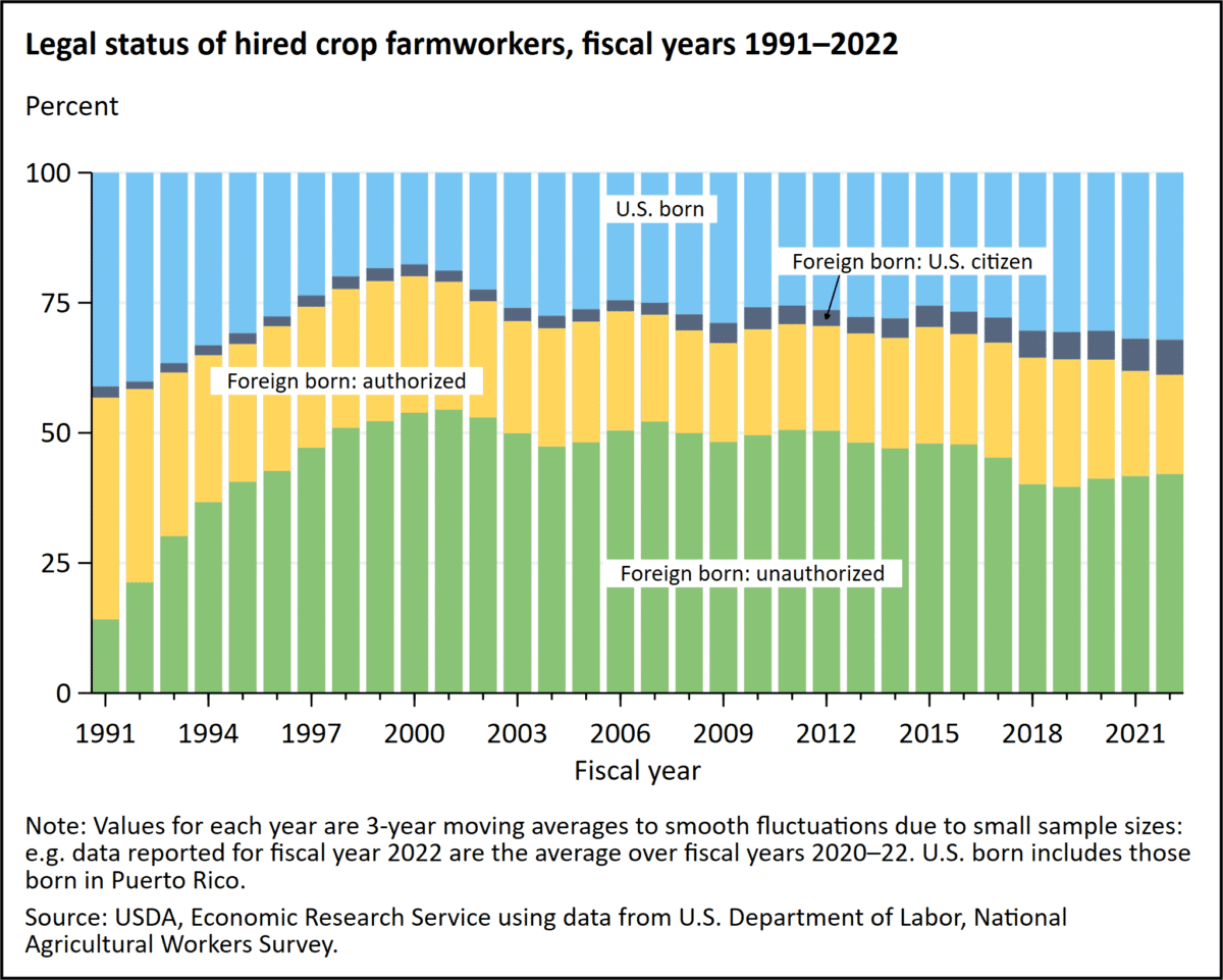 Government surveys indicate about 42% of the estimated 2 million farmworkers in the United States are undocumented. Hundreds of thousands of others work in meatpacking plants, grocery stores and restaurants, facing low wages, few rights, and at times exploitative and hazardous conditions. The Trump administration’s decision to rescind humanitarian parole programs have left many more immigrants undocumented and out of work, further reducing the available workforce.